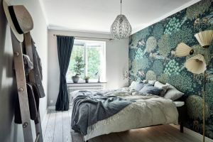 Antud magamistoa seinu katab Arne Jacobseni tapeet "Klöver", mis sobitub kenasti toas leiduvate toonidega, mis langevad kokku tapeedimustril olevate toonidega. Ruumis sobitatud kokku mitmed looduslikud toonid. Nii erinevad liivakarva toonid (valgusti, tumba, vaip) kui heleroheliseks värvitud kapp, samuti valged tekstiilkardinad ja voodipesu, loovad omavahel täiusliku kombo. Magamistoa laes efektne tekstiilist laelamp Hilma loob magamistuppa õdusa meeleolu.