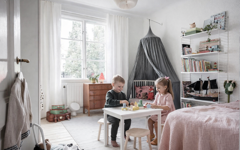 Seinalt leiame ilusaid pisikesi mudellaevu, mis otsekui sõuavad läbi kujuteldavate lainete, lisades ruumi eripära ja toredat mängulisust. Nagid, mis võiksid esmalt tunduda lihtsalt praktilised, on saanud merehõngulise välimuse ning neid kaunistavad vanad aerud. Need aerud, mis kunagi kuulusid võib-olla päris paadile, on saanud uue elu lastetoa sisustuses, andes sellele veidi ajaloohõngu. Sinna juurde lisanduvad triibumustrid, mis on samuti mereteemaga tihedalt seotud, meenutades meremeeste riietust või lainetust rannal. Need detailid loovad tunde, et tuba on kui väike mereäärne maailm, kuhu on lastel rõõm tagasi tulla.