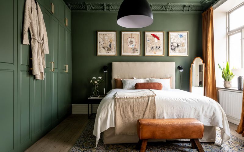 Antud magamistoa seinu katab Arne Jacobseni tapeet "Klöver", mis sobitub kenasti toas leiduvate toonidega, mis langevad kokku tapeedimustril olevate toonidega. Ruumis sobitatud kokku mitmed looduslikud toonid. Nii erinevad liivakarva toonid (valgusti, tumba, vaip) kui heleroheliseks värvitud kapp, samuti valged tekstiilkardinad ja voodipesu, loovad omavahel täiusliku kombo. Magamistoa laes efektne tekstiilist laelamp Hilma loob magamistuppa õdusa meeleolu.