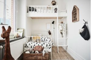 Seinalt leiame ilusaid pisikesi mudellaevu, mis otsekui sõuavad läbi kujuteldavate lainete, lisades ruumi eripära ja toredat mängulisust. Nagid, mis võiksid esmalt tunduda lihtsalt praktilised, on saanud merehõngulise välimuse ning neid kaunistavad vanad aerud. Need aerud, mis kunagi kuulusid võib-olla päris paadile, on saanud uue elu lastetoa sisustuses, andes sellele veidi ajaloohõngu. Sinna juurde lisanduvad triibumustrid, mis on samuti mereteemaga tihedalt seotud, meenutades meremeeste riietust või lainetust rannal. Need detailid loovad tunde, et tuba on kui väike mereäärne maailm, kuhu on lastel rõõm tagasi tulla.