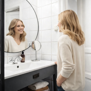 Põrandal on aga midagi erilisemat – elegantne keraamiline põrandaplaat, mille disain meenutab viktoriaanlikku ajastut. Selle geomeetriline muster lisab ruumile omaette karakteri, pakkudes silmale rahuldustpakkuvat visuaalset mängu. Mustri täpsus ja korduvad elemendid viivad mõtted ajastusse, kus peensusi hinnati, kus iga detail oli hoolikalt läbi mõeldud. Nii värvi kui tekstuuri poolest on see põrand ideaalne kombinatsioon puhaste, valgete seintega, pakkudes rahulikku kontrasti ja lisades sügavust kogu ruumile. Sisustusdetailid mängivad selles harmoonias omaette olulist rolli. Kõik vannitoa elemendid on valitud hoolikalt, hoides kinni kergest ja puhtast valge värvigammast, mis jätkub nii seinte, mööbli kui ka väiksemate aksessuaaride juures. Kõik kroomitud pinnaga segistid on justkui selle elegantse koosluse krooniks.