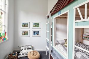 Voodi, millel on kaks paksemat madratsit, on paigutatud ruumi avara akna alla, et luua ruumikas ja hubane magamisnurk. Madratsite kohal seinal on String riiulisüsteem valgete riiulitega, millel leidub erinevaid raamatuid ja mänguasju, lisades toale funktsionaalset sära ja kordumatut iseloomu.