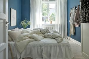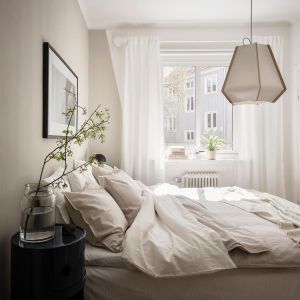 Antud magamistoa seinu katab Arne Jacobseni tapeet "Klöver", mis sobitub kenasti toas leiduvate toonidega, mis langevad kokku tapeedimustril olevate toonidega. Ruumis sobitatud kokku mitmed looduslikud toonid. Nii erinevad liivakarva toonid (valgusti, tumba, vaip) kui heleroheliseks värvitud kapp, samuti valged tekstiilkardinad ja voodipesu, loovad omavahel täiusliku kombo. Magamistoa laes efektne tekstiilist laelamp Hilma loob magamistuppa õdusa meeleolu.