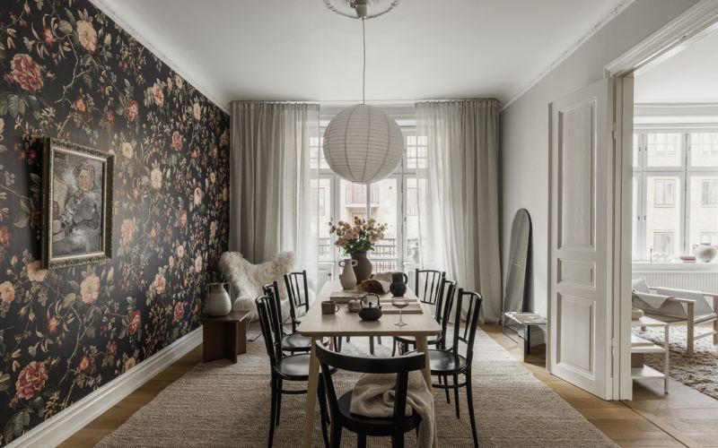 Kardinad mitte ainult ei täida praktilist eesmärki, vaid annavad ka esteetiliselt kogu ruumile juurde sügavust ja mõtestatust. Põrand on kaetud hästi säilinud ja hoolikalt restaureeritud originaalse puitpõrandaga, mis lisab ruumile soojust ja iseloomu. Elutoa osa jätkab sama avaruse ja valguskülluse joont, luues tunde, et kogu ruum on ühtaegu kaasaegne ja ajatu. Elutoa seinad on dekoreeritud puitliistudega, mis on õrnalt seinavärviga ühtlustatud, et tagada puhas ja viimistletud ilme. Selline minimalistlik ja peen detailide kasutamine loob seose hoone algse arhitektuuriga, kuid samas jääb piisavalt ruumi ka kaasaegsetele sisustuslahendustele. Seinad, põrand ja laed loovad harmoonilise terviku, mis on neutraalses ja rahulikus värvitoonis, võimaldades sisustuselementidel ja dekoratsioonidel omavahel kenasti mängida.